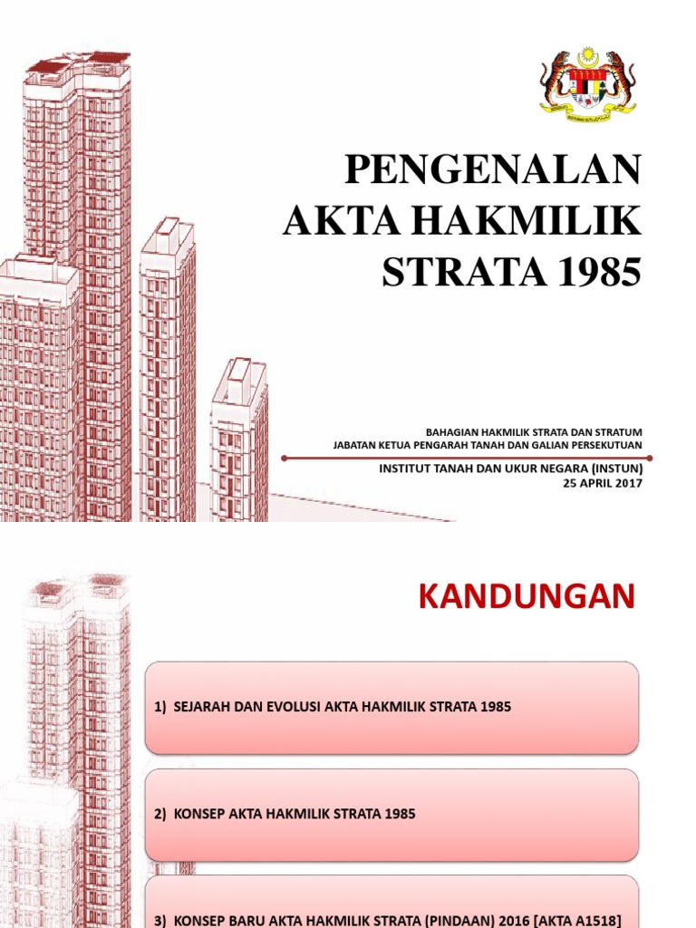 Let us know what's wrong with this preview of akta hak milik strata 1985 by helmi hussain. Memberi penerangan ringkas mengenai akta hakmilik strata iaitu akta yang membolehkan hakmilik didaftarkan bagi petak/premis yang terdapat pengeluaran hakmilik subsidiari. Akta hakmilik strata 1985 akta hakmilik strata 1985 (ahs), menyediakan urusan pecah bahagi bangunan dan tanah bagi hartanah yang dikongsi. Tempoh kesemua geran hak milik strata mansuh, sama ada di akhir pajakan atau pelan strata dibatalkan oleh pesuruhjaya tanah. Akta hak milik strata by mohd.