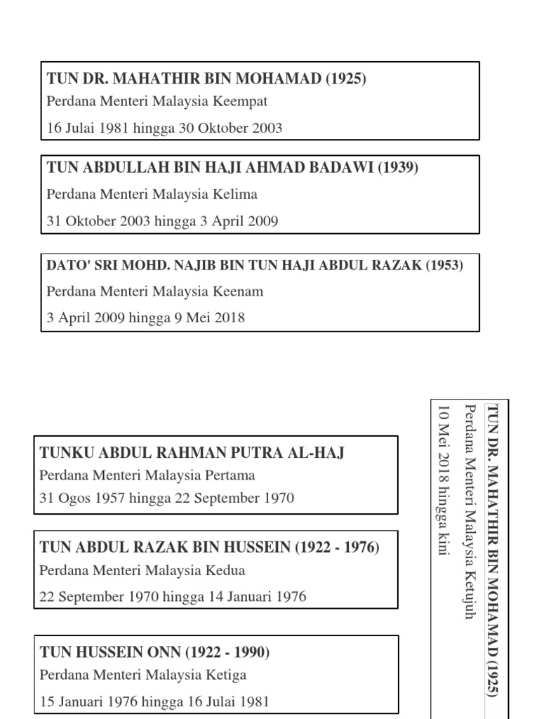 Biodata Tun Dr Mahathir Bin Mohamad from imgv2-1-f.scribdassets.com Perdana menteri ialah pemimpin utama kerajaan malaysia. Senarai nama perdana menteri serta bekas perdana menteri malaysia ini mengandungi nama penuh, gambar, tarikh lahir, serta tarikh meninggal bagi perdana menteri yang telah meninggal dunia, gelaran, serta tempoh memegang jawatan. Perdana menteri malaysia keempat 16 julai 1981 hingga 30 oktober 2003. So siapa agaknya perdana menteri malaysia yang ketujuh? Senarai nama perdana menteri serta bekas perdana menteri malaysia ini mengandungi nama penuh, gambar, tarikh lahir serta tarikh meninggal dunia, gelaran, dan tarikh mula serta tamat memegang jawatan. Perdana menteri malaysia adalah adalah kepala pemerintahan tertinggi di malaysia. Najib bin tun haji abdul razak. Seorang perdana menteri juga bertanggungjawab untuk mengetuai barisan badan eksekutif, jemaah menteri.