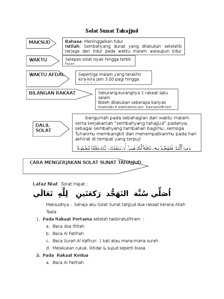 Solat tahajud adalah solat sunat dua rakaat. Niat lafaz niat ialah maksud: Ia menjadi kewajiban pada baginda. Solat ini dilakukan selepas bangun dari tidur pada dua per tiga malam. Aku niat shalat sunat tahajud 2 rakaat, menghadap kiblat, karena allah ta'ala. • tata cara sholat tahajud mengenai cara sholat tahajud tidak jauh berbeda dengan sholat sunnah umumnya yaitu sebagai berikut : Jumalah rakaat sholat tahajud sholat tahajud dikerjakan dengan jumlah minimal 2 rakaat dan maksimal tidak terbatas karena termasuk sholat sunat mutlak, dengan setiap 2 rakaat satu salam. Adapun tata cara duduk pada tasyahhud akhir ini hendaknya orang yang sholat duduk pada pangkal pahanya yang kiri dengan posisi kaki kiri yang keluar. Tata cara pelaksanaan shalat tahajud yang baik dan benar beserta bacaan doa sholat tahajjud/shalat malam. Sahaja aku solat sunat tahajud dua rakaat kerana allah taala. Kemudian sambung baca doa solat sunat tahajjud. Sholat tahajud sangat dianjurkan oleh allah swt. Berjaga malam untuk beribadah sangat dituntut oleh agama islam dan cara ibadah yang paling utama adalah sembahyang tahajud atau solat malam.