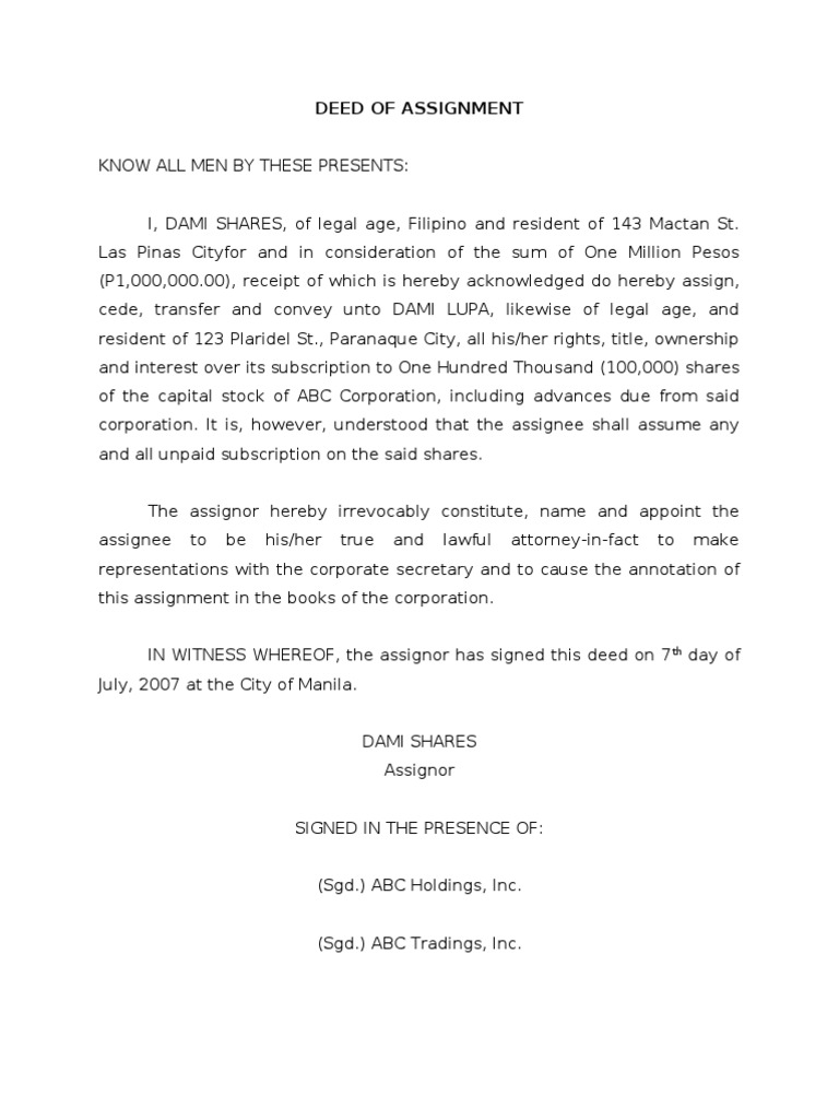 A legal agreement to give an asset or to sell a debt to someone else meaning of deed of assignment in english. A deed of assignment is a legal agreement between the assignor and assignee about ownership of a land.click for more details about the deed of assignment. Select deed of assignment samples and templates have been included in. Signing a deed of assignment and having that deed is your number 1 evidence against another person that is trying to claim ownership of that same land too. A reservation operates at law whether or not the purchaser executed the deed of assignment out of which the reservation is created. If you have a land and no deed yet, i feel sorry for you! Signed as a deed by signatory (participant) name: Start studying deed of assignment. 09052295008 welcome today we will be looking at one of the most important land document use in nigeria which is. Malaysia assignment help is the most popular & most trusted assignment helper in malaysia. A doa (deed of assignment) is usually used to transfer rights on an article from one person to another. Includes any variations or supplements thereof Malaysia is a federal constitutional monarchy located in southeast asia.